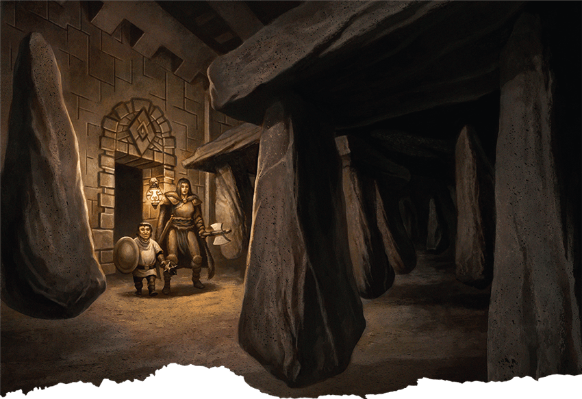 To the south was a long-abandoned privy. To the north, the tunnel led to a charnel house where giant rats feasted upon some travelers’ corpses marked with the sign of the Cult of the Black Earth. Flame magic destroyed the rats and the party moved on, but not before several were overcome by the stench.